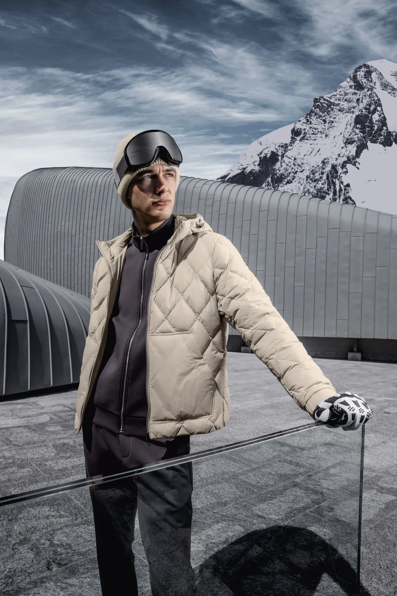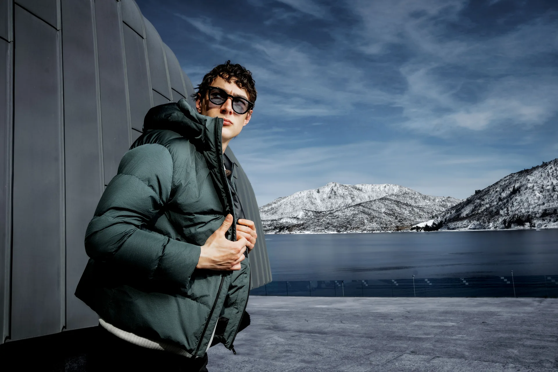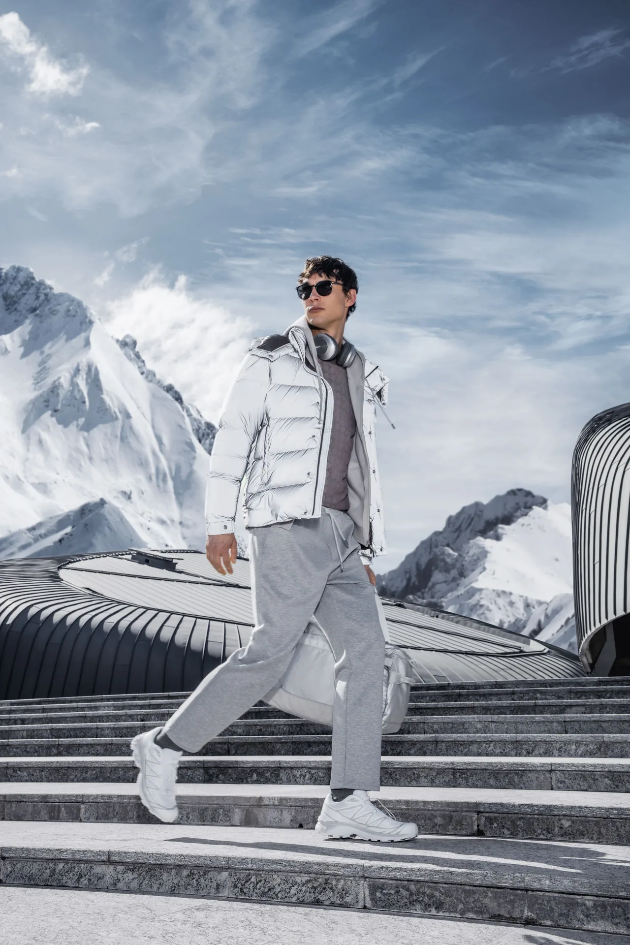 A vast winter landscape where mountains descend toward the still surface of a lake, mirrored in cold, luminous air. Along the shore a futuristic architecture with its curved volumes and sharp textures cutting through the scene in different shades of gray. In this extreme and silent environment, the S.D. SPONTINI's collection garments take form, designed for atmospheres where nature feels immense and close. A story of performance that is shaped by a vision.