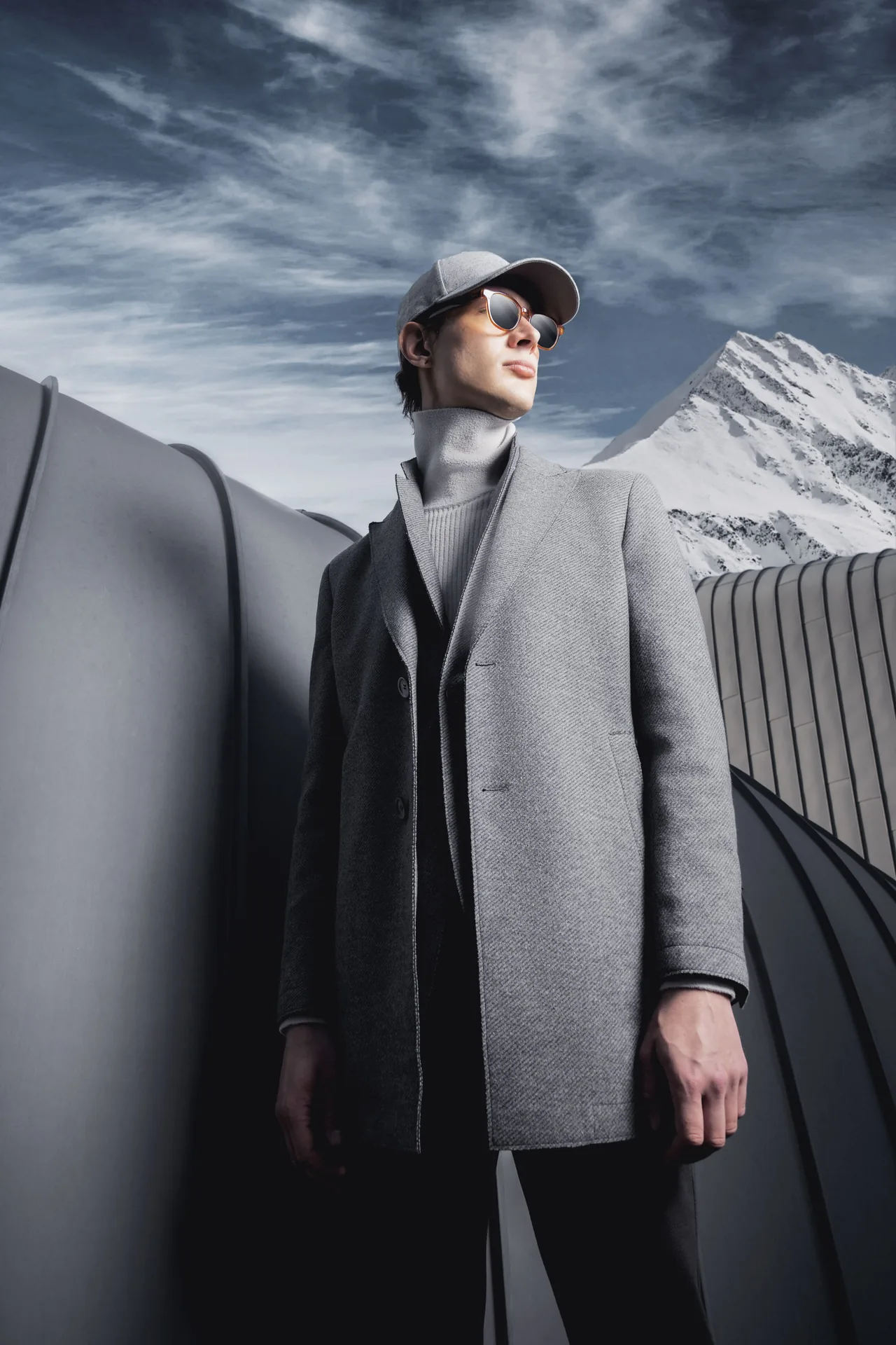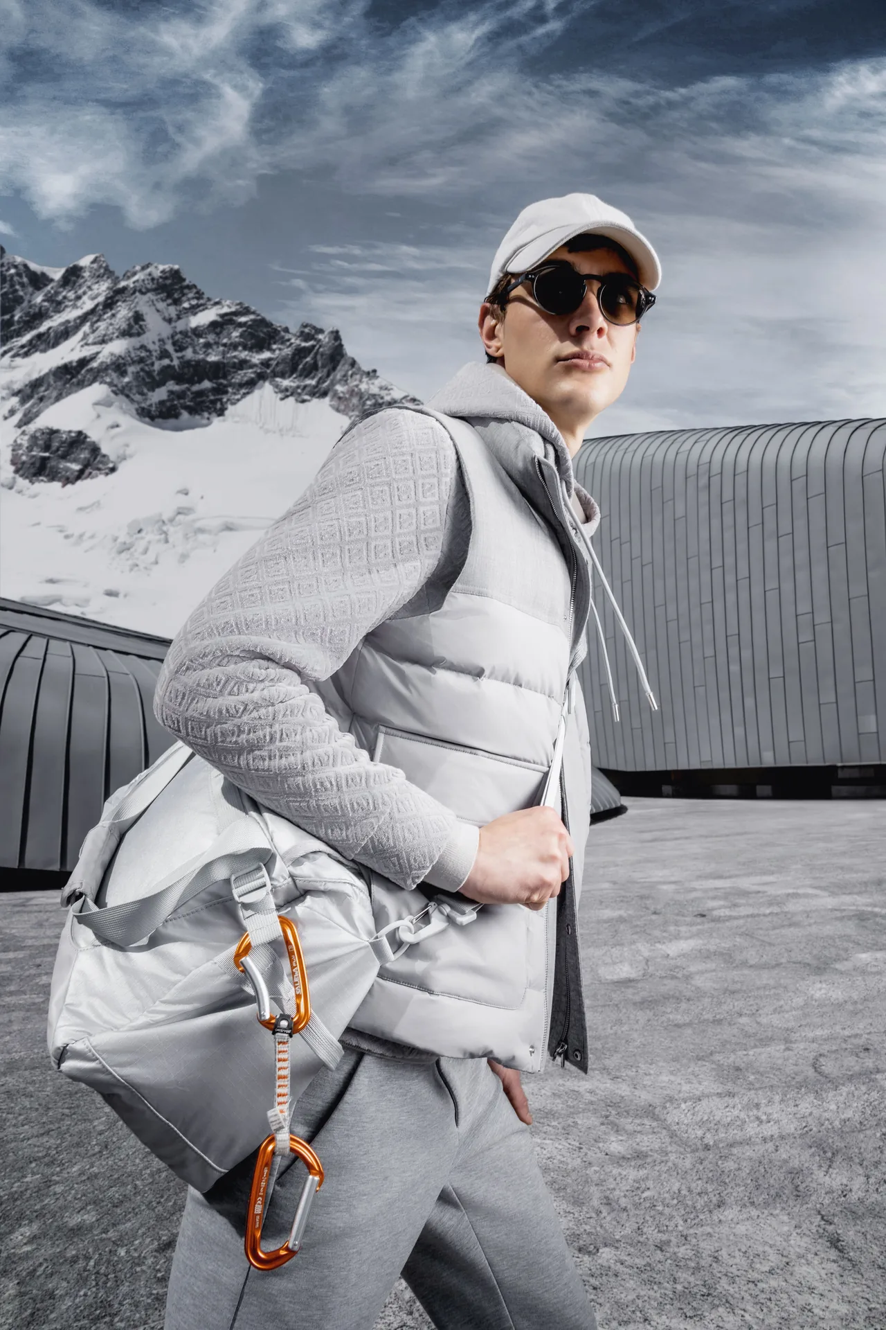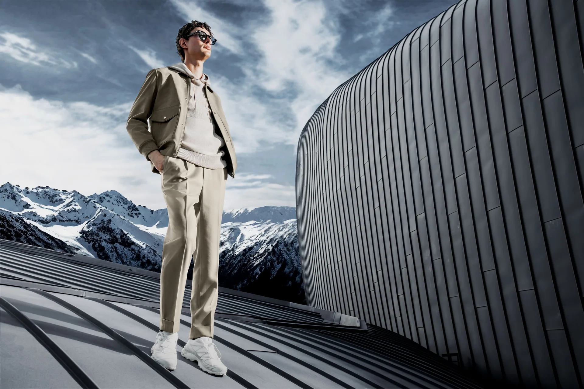 A vast winter landscape where mountains descend toward the still surface of a lake, mirrored in cold, luminous air. Along the shore a futuristic architecture with its curved volumes and sharp textures cutting through the scene in different shades of gray. In this extreme and silent environment, the S.D. SPONTINI's collection garments take form, designed for atmospheres where nature feels immense and close. A story of performance that is shaped by a vision.